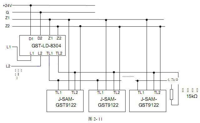 作為手動火災報警按鈕使用時,將報警按鈕的Z1、Z2端子直接接入火災報警控制器總線上即可。作為手動火災報警按鈕及消防電話插孔使用時,將報警按鈕的Z1、Z2端子直接接入火災報警控制器總線上,同時將報警按鈕的TL1、TL2端子與GST-LD-8304消防電話模塊連接,具體見圖2-11所示(最末端報警按鈕的TL1、TL2接線端子接4.7kΩ終端電阻)。